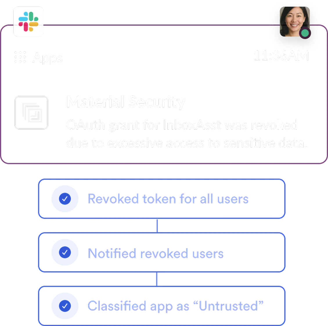 The agent can programmatically revoke OAuth tokens autonomously, flag critical risks for review, or work directly with your users in Slack, effectively eliminating toil but keeping humans in the loop when necessary.