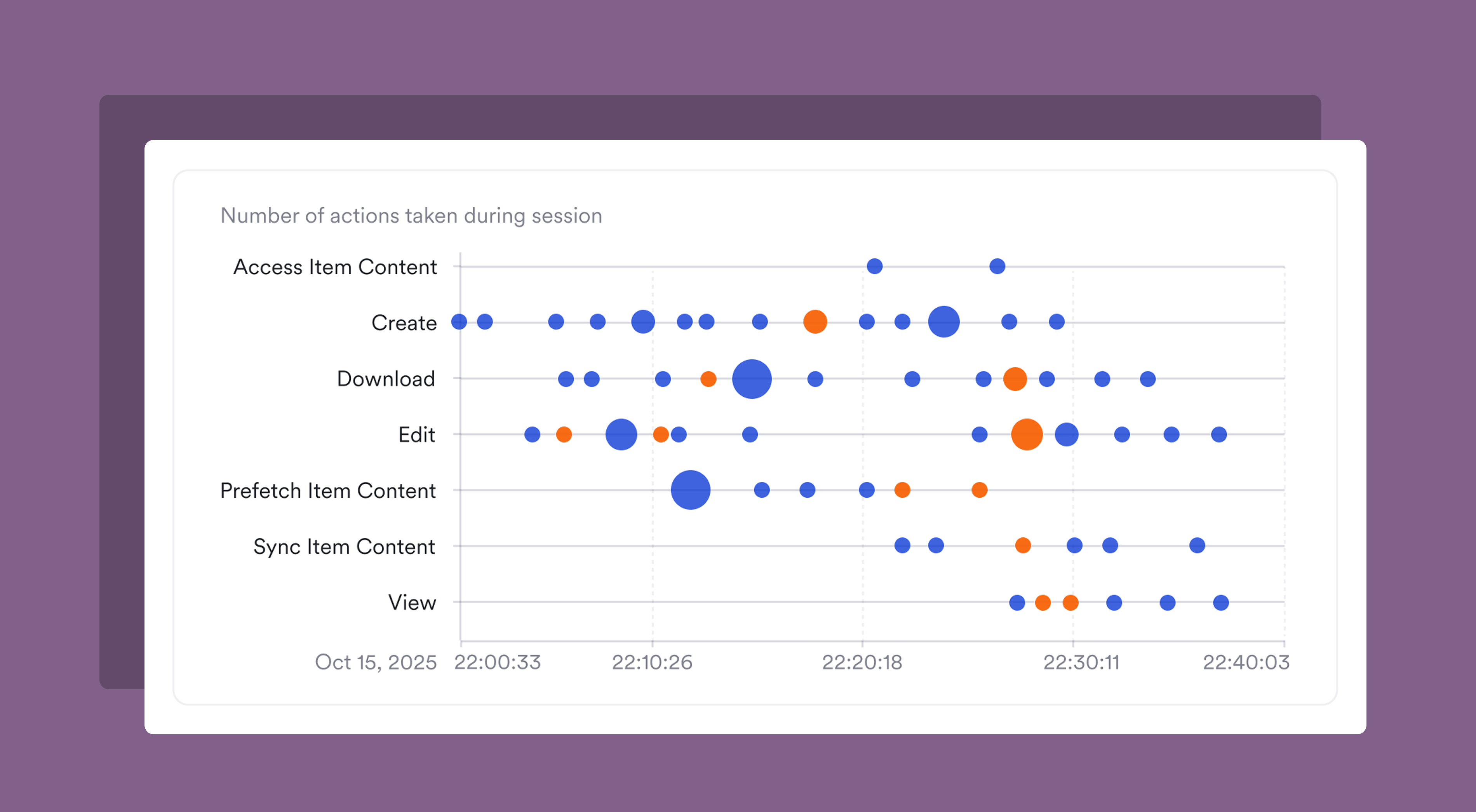 We ended up choosing a bubble chart for this evidence because it could encode three dimensions in a single view: actions taken over a given session (broken out by action type), volume of actions taken, and the sensitive nature of the files being actioned. That density is intentional: an analyst triaging this alert needs to grok the shape of the session quickly, not scroll through multiple panels of data to assemble a picture themselves.