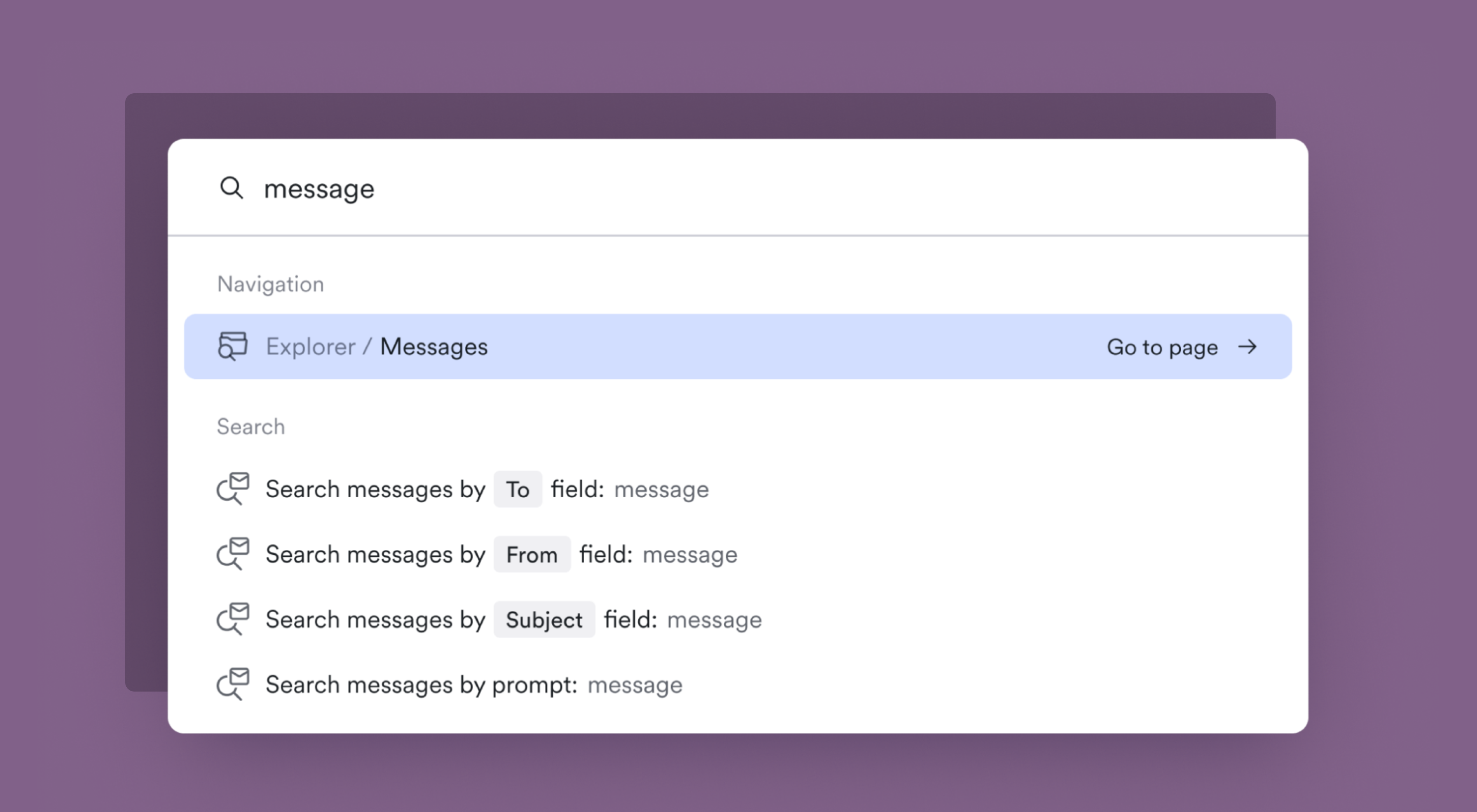 The first change was simple, but extends a key interaction pattern in Material that we aim to continue to improve. We added an option to the global CMD+K palette that provides a quick pivot into message search from anywhere in the app. Before, to launch a search, users had to navigate to the Explorer section and into message search.